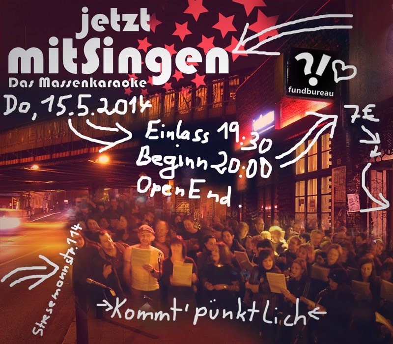 Erstmals singen wir alle zusammen im Fundbureau an der Sternbrücke/Stresemannstraße. Wir denken: Ein guter Ort! Vor allem: Es gibt keinen Vorverkauf… nur Abendkasse… das Fundbureau ist (so hoffen wir) groß genug, dass alle reinkommen. Wir freuen uns, wenn Ihr schön pünktlich da seid… – wer zu spät kommt, verpasst die besten Lieder 😉