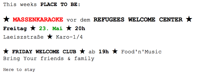 Ziemlich spontan, vor allem aber draußen sind wir diesen Freitag (23.5.) beim Refugees Welcome Center Hamburg.